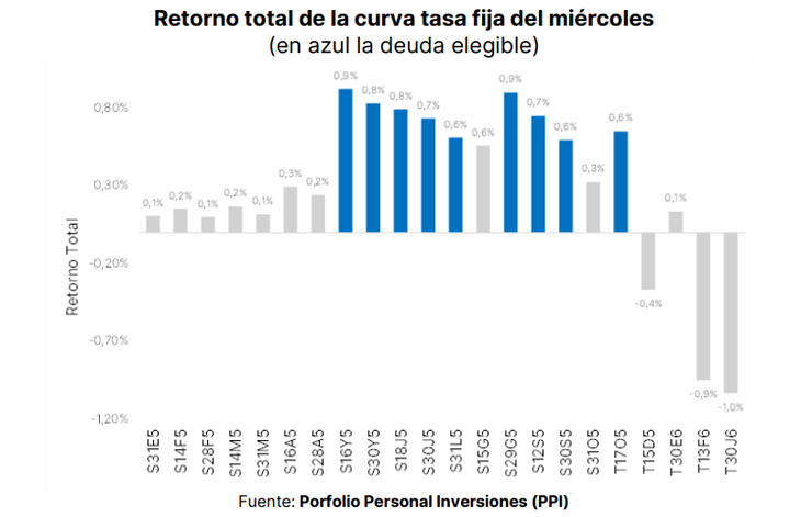 PPI destacó que, este miércoles, los títulos del tramo medio (los que vencen entre mayo y octubre) que pueden adherirse a la operación treparon entre 0,6% y 0,9% frente a sus pares cortos/medios, que avanzaron hasta 0,3%. Por el contrario, los Boncap más largos (que competirán contra los nuevos bonos duales) retrocedieron hasta 1%, destacó la firma.