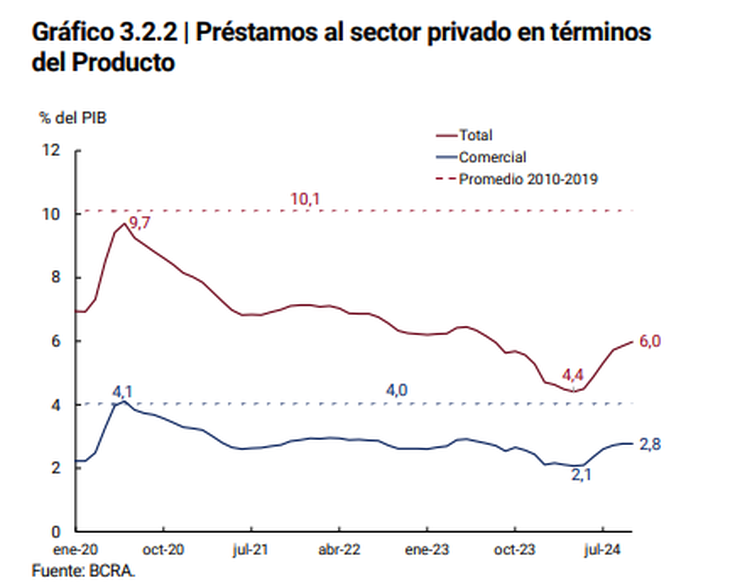 "En términos del PBI, el crédito al sector privado habría ascendido a 6%, acumulando un aumento de 1,6 puntos porcentuales en el último semestre", señaló el informe del BCRA. En abril, el ratio de préstamos sobre el producto había tocado un piso del 4,4%.