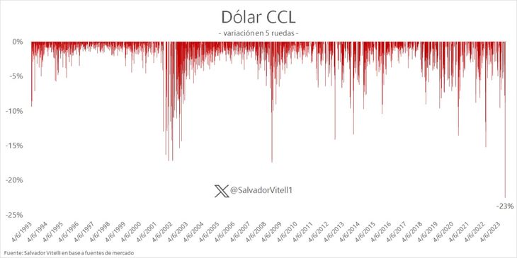 Por su parte, el economista Salvador Vitelli resaltó que en los días previos a las elecciones el CCL tuvo subas "fenomenales" y ahora se está observando un reacomodamiento de precios hacia valores preelectorales. "La baja abrupta que se da porque habíamos tenido fuertes subas los días anteriores a los comicios", señaló.
