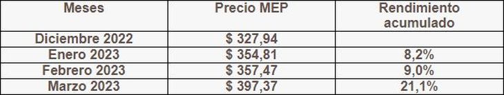 . - Creemos que a partir de ahora tendremos una suba similar a la inflación más un plus adicional. El dólar MEP debería buscar como objetivo un valor cercano a los $ 450. No obstante, la intervención del gobierno lo mantiene debajo de los $ 400. Creemos que para fin de abril podría estar en torno de $ 430. Creemos que le puede volver a ganar a la inflación.