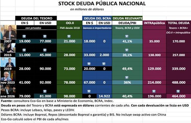 Al observar el gráfico que elaboró la consultora Eco-Go, se concluye que la deuda del Tesoro en pesos y en dólares con privados y con OOII fue de u$s107 mil millones en apenas cuatro años.