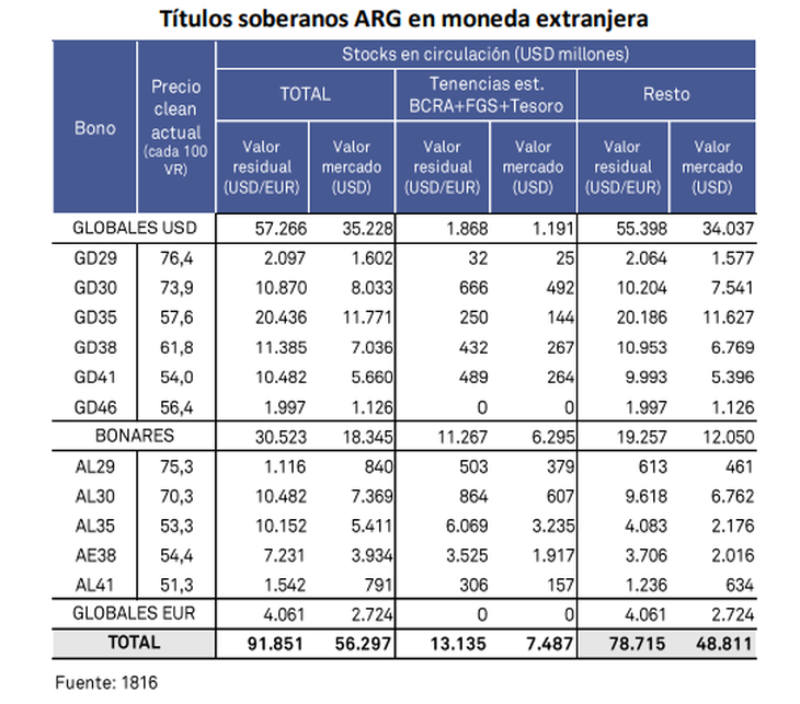 En ese caso, por el lado de los globales, del GD29 quedarían en el mercado en manos de privados u$s1.579 millones, mientras que del GD30, otros u$s7.531 millones. Los de legislación nacional AL29 tienen otros u$s461 millones y los AL30 u$s 6.762 millones. En total, serían u$s16.341 millones.