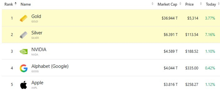 El ranking global por capitalización de mercado muestra un liderazgo inusual de los metales preciosos, en una jornada marcada por un renovado apetito defensivo. El oro encabeza la lista con una valuación cercana a los u$s36,9 billones y una suba diaria del 3,8%, mientras que la plata se ubica en el segundo lugar, con un market cap de u$s6,4 billones y un avance aún más pronunciado, del 7,2%.