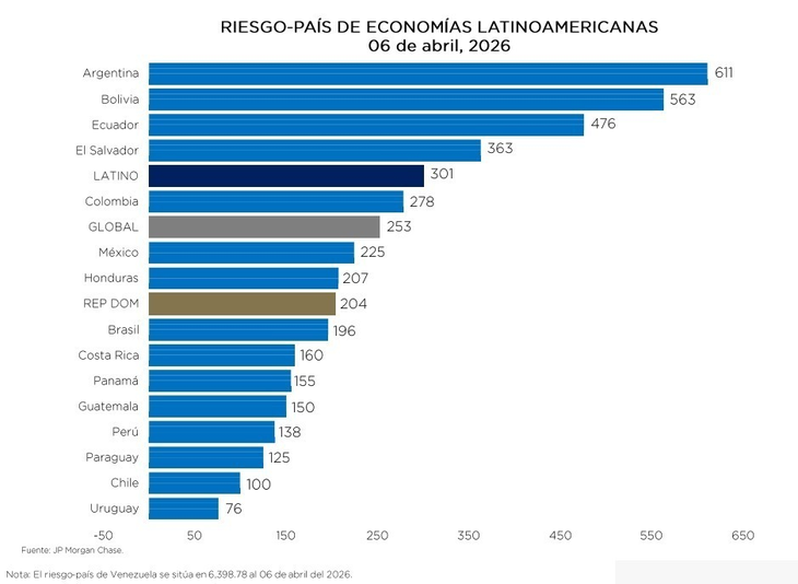 El 6 de abril, un día antes de la fecha de ultimátum que Donald Trump le impuso a Irán para que definan un principio de acuerdo, Argentina lideraba la lista con el riesgo más alto de Latinoamérica (611 puntos), seguida de cerca por Bolivia (563) y Ecuador (476). Para tener de referencia, cabe resaltar, que el promedio Latinoamericano es de 301 puntos y el promedio Global se ubica en 253. Países como Colombia, México y Brasil se sitúan por debajo del promedio regional.