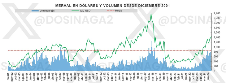 A su turno, el analista financiero Daniel Osinaga aportó a este medio un gráfico del S&P Merval medido en dólares ajustado por inflación, donde se puede ver el pico del 2018 y cómo aún está lejos de ese máximo, si bien este año hubo un fuerte avance que lo ubicó por encima de la media.