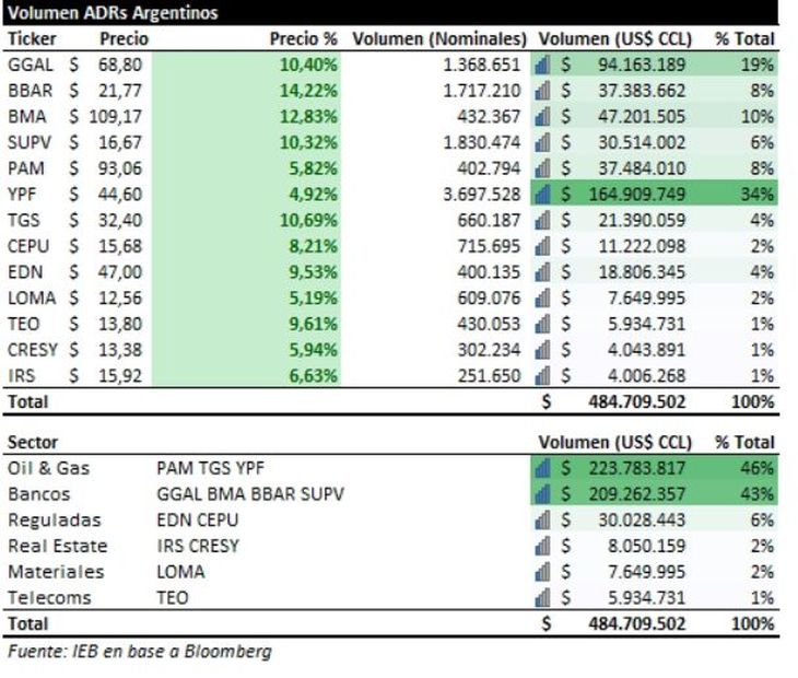 La primera rueda de 2025 fue sobresaliente en cuanto al volumen operado: se registraron u$s485.000 millones, nuevamente con el ticket de YPF como el más buscado (34%). Además, el flujo fue bastante parejo entre Oil & Gas (46%) y los bancos (43%). El total operado del equity argentino fue de u$s581.000 millones, señalaron desde Grupo IEB.
