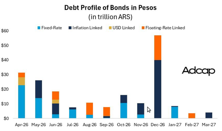 Según datos de Adcap Grupo Financiero, en realidad los vencimientos alcanzan a unos $30 billones, la mayor parte de ellos de bonos de tasa fija, y una proporción menor en dólar linked y CER. Desde el Centro de Estudios Económicos del Banco Provincia estimaron en $19 billones en manos de privados.