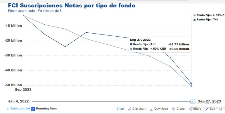 Específicamente desde Aurum, advirtieron que desde el 19 de septiembre hasta finales del mes pasado, los FCI T+1 y CER sufrieron rescates por casi $100.000 millones diarios. Una tendencia que continúa en los primeros días de octubre.