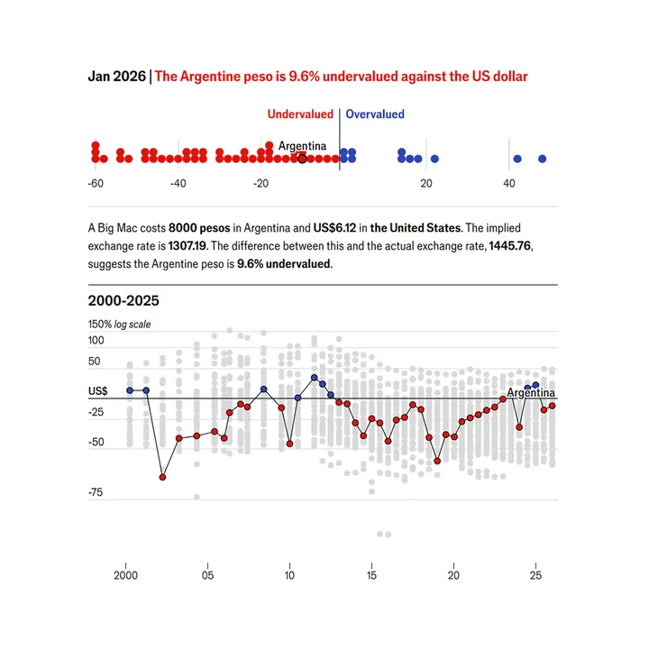 Según el último relevamiento del semanario británico, que promedia el precio del Big Mac en cuatro ciudades argentinas, el sándwich cuesta alrededor de $8.000. En Estados Unidos, el mismo producto vale u$s6,12. Bajo esa comparación, el tipo de cambio que igualaría los precios sería de $1.307,19, por debajo del tipo de cambio oficial de $1.445,76 considerado por el índice. El resultado: el peso aparece subvaluado en torno al 9,6% frente al dólar.