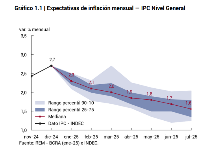 El REM publicado el jueves pasado por el BCRA arrojó una proyección de inflación para el primer semestre cercana al 2% mensual promedio, por debajo de lo previsto en el sondeo del mes anterior. En concreto, 2,3% para enero; 2,1% para febrero; 2% para marzo; 1,9% para abril; 1,8% para mayo; y 1,7% para junio.