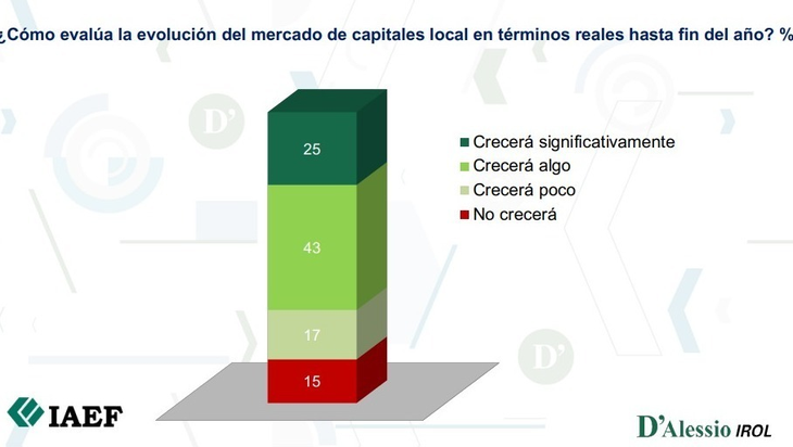 Un 25% de los participantes considera que el mercado de capitales va a crecer significativamente hasta fin de año, en tanto que el 43% cree que va a crecer algo, para el 17% crecerá poco y un 15% apuesta a que no crecerá.