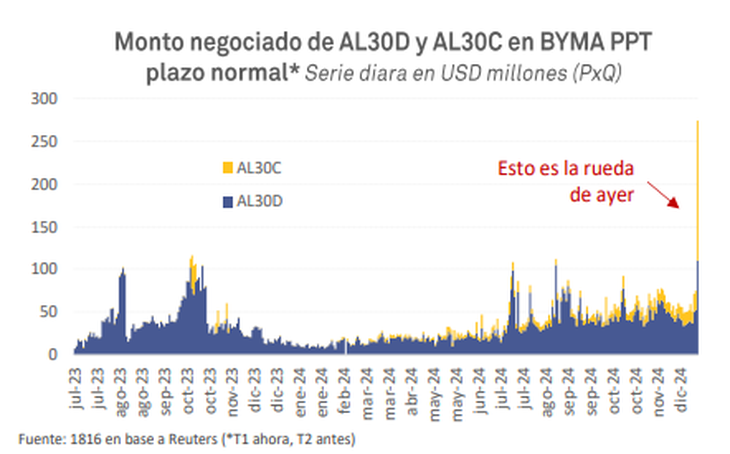 Así, el Gobierno decidió salir a marcar la cancha. Tras un noviembre sin intervención y luego de un par de ruedas en las que dejó correr las cotizaciones, el BCRA puso unos u$s200 millones el miércoles para contener la escalada del dólar MEP y el CCL. A partir de entonces, la tensión se aplacó en las siguientes dos ruedas.