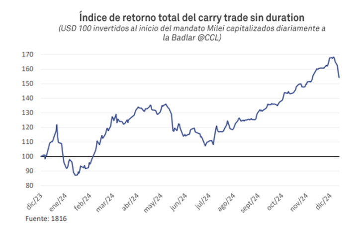 “Desde que asumió (Javier) Milei, estar invertido en pesos a la tasa Badlar rindió un impresionante 54% midiendo al CCL, pero lo más interesante es que quizás desde julio (o sea, desde que el Central anunció que esterilizaría en el MEP los pesos impresos por intervenciones en el tipo de cambio oficial) recién ayer (por el miércoles) cerramos el primer período de 30 días en que el ‘carry trade’ dio rendimientos negativos en moneda dura”, destacó un reciente informe de 1816.