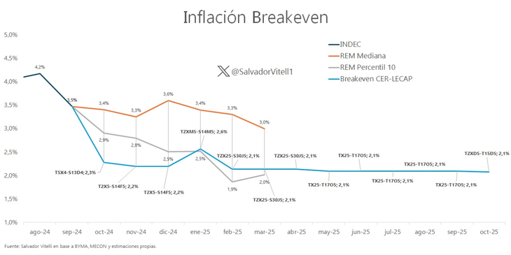 En diálogo con Ámbito, el economista Salvador Vitelli, de Romano Group, calculó que la "inflación breakeven" bajó hasta un punto y quedó a punto de tocar el 2% mensual como promedio de acá a las elecciones de medio término (hasta acá rondaba el 2,5%). En concreto, con los valores vigentes a las 15 horas del lunes, estimó que la expectativa implícita era del 2,3% para octubre, del 2,2% para noviembre y diciembre; del 2,6% para enero, y del 2,1% desde febrero hasta octubre de 2025.