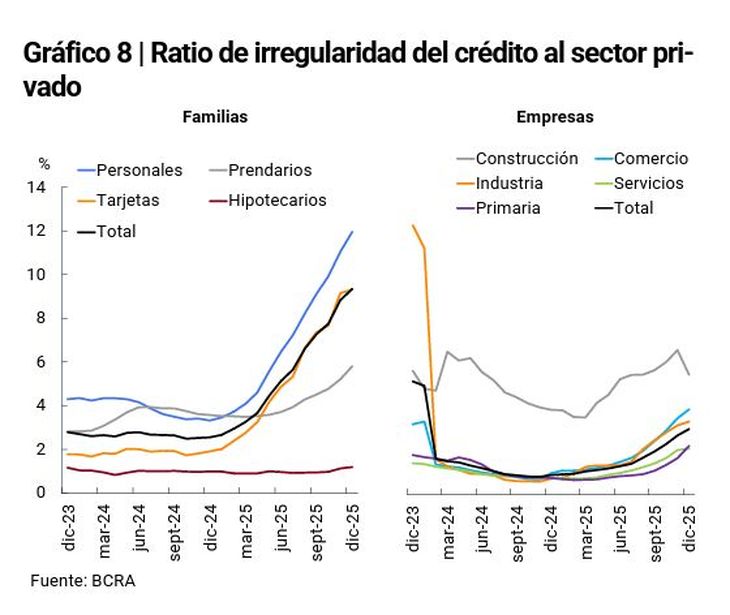 En el segmento corporativo, la irregularidad del crédito también mostró un leve deterioro en diciembre. El ratio de mora de las empresas avanzó 0,2 puntos porcentuales en el mes y se ubicó en 2,5%, todavía muy por debajo del nivel observado en los hogares.