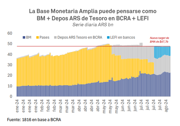 La consultora 1816, en su informe semanal, le puso números a la afirmación: la base monetaria (BM) hoy ronda los $22,6 billones y la base monetaria amplia (que, según su análisis, incluye la BM, los depósitos del Gobierno en el BCRA y el stock de LEFI en poder de los bancos) se ubica en $47,7 billones, en línea con el margen de expansión monetaria máximo pautado por el Central. “Si es así, pareciera que falta mucho”, sostuvo 1816.