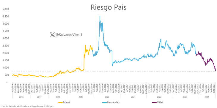 Así, el riesgo país bajó 3,5%, o 28 unidades, perforó las 800 unidades y se ubicó en los 772 puntos básicos, mínimos desde abril de 2019, según consignó Salvador Vitelli, Head of research de Romano Group.