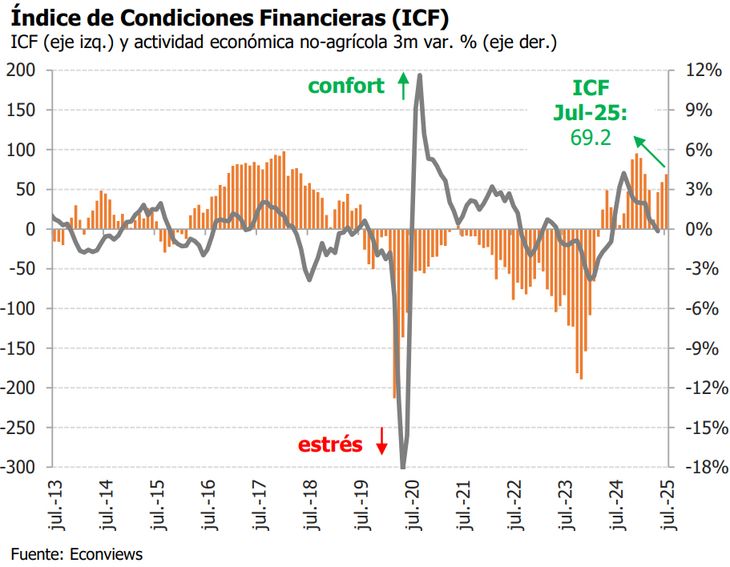 Las condiciones financieras mejorar en julio y alcanzaron su mejor marca en cinco meses impulsada por el contexto global, pese a que se enfrió el crédito local. A nivel externo, los anuncios comerciales de EEUU trajeron un poco de luz y redujeron la volatilidad de los futuros de las materias primas y las acciones emergentes.