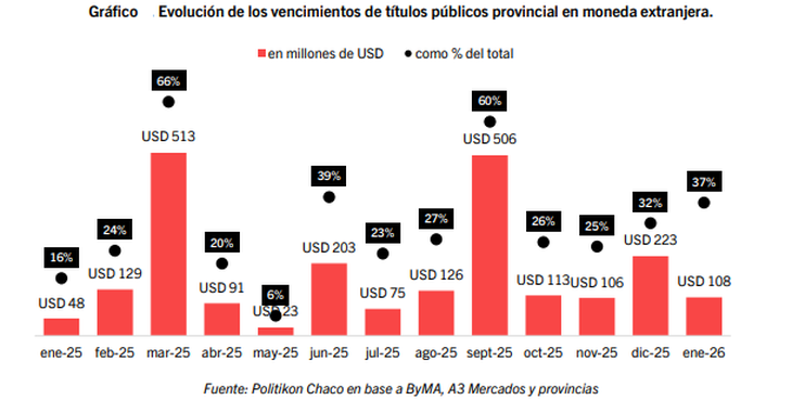 En enero Córdoba pagó u$s35,3 millones del CO32d y u$s10 millones del CO26; Chubutoabonó u$s32 millones del PUL26; Neuquén abono u$s26,6 millones del BNA26 y Tierra del Fuego u$s5,8 millones del TFU27.