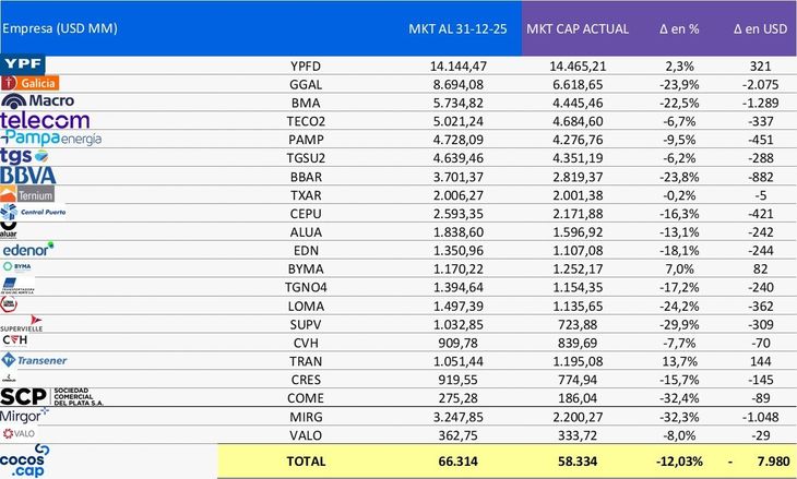 Según Tobias Sanchez, portfolio manager de Cocos Capital, el primer trimestre está siendo negativo para el equity argentino. "En lo que va del trimestre, la capitalización bursátil de las principales compañías locales cae cerca de 12% en dólares, mostrando una corrección bastante generalizada entre sectores", explicó.