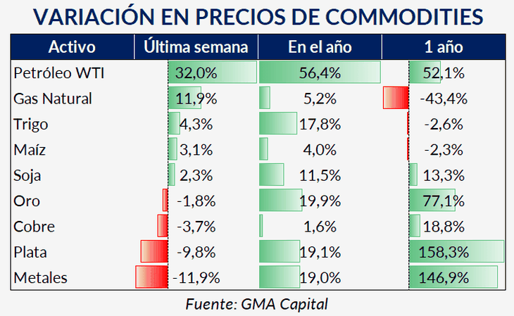 De hecho, el Brent superó los u$s90 por barril, con una suba cercana al 28%, mientras que el WTI trepó más de 35%, al tiempo que también avanzaron los granos: soja (+1,7%), trigo (+3,1%) y maíz (+2,4%).