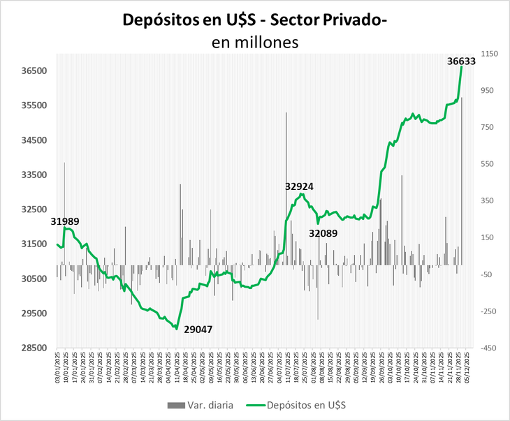 Los depósitos en dólares tocaron un nuevo récord por encima de los u$s36.600 millones.