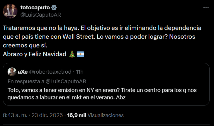 “Trataremos que no la haya. El objetivo es ir eliminando la dependencia que el país tiene con Wall Street. ¿Lo vamos a poder lograr? Nosotros creemos que sí”, escribió Caputo, al ser consultado sobre la posibilidad de una emisión en Nueva York durante enero. El ministro cerró su mensaje con un saludo por las fiestas: “Abrazo y Feliz Navidad”.