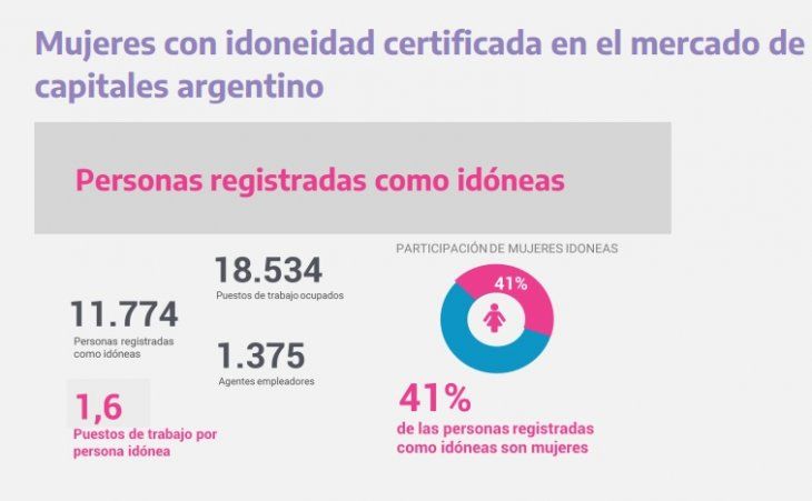 Quizás el dato más auspicioso del informe fue que el 41% de personas con idoneidad certificada en el mercado de capitales en 2021 fueron mujeres del total de 11.774 de personas registradas con esa denominación y de los 18.534 puestos de trabajo ocupados. Sin embargo otros datos demuestran que la brecha aún es amplia.