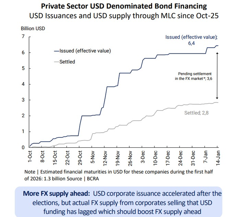 Para el BCRA, este flujo resulta relevante y así lo destacó en el último informe de Vladimir Werning, donde subrayó la aceleración de las emisiones corporativas desde los comicios y advirtió que la oferta efectiva de divisas proveniente de la liquidación de esos fondos aún se encuentra rezagada, lo que anticipa un mayor ingreso de dólares al mercado cambiario.
