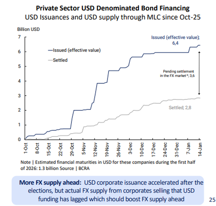 Las emisiones de obligaciones negociables (ON) en dólares son hoy uno de los motores principales de la oferta de divisas en el mercado oficial de cambios. Según los cálculos del BCRA, difundidos en una charla con inversores por su vicepresidente, Vladimir Werning, las empresas ingresaron al país unos u$s2.800 millones desde octubre, que fueron liquidados en el mercado oficial. Según esos mismos números, aún quedan por liquidar u$s3.600 millones de ON que ya fueron emitidas, lo que entusiasma a los funcionarios con que la calma pueda prolongarse.