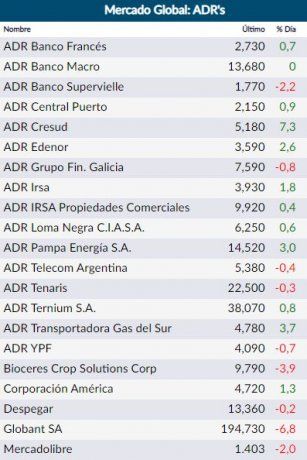 En Wall Street, por su parte, los activos de empresas argentinas finalizaron la jornada de forma mixta. Las subas fueron encabezadas por Cresud (+7,3%); Transportadora Gas del Sur (+3,7%), y Pampa Energía (+3%). En contrapartida, los lideraron los retrocesos las acciones de Globant (-6,8%); Bioceres (-3,9%); y Supervielle (-2,2%).