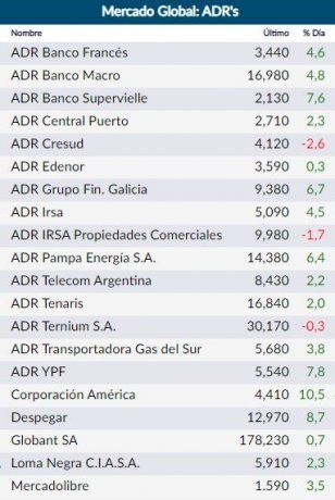 En Wall Street, por su parte, las principales subas de los ADRs argentinos fueron anotadas por Corporación América (+10,5%); Despegar (+8,7%); YPF (+7,8%); Supervielle (+7,6%); Galicia (+6,7%); y Pampa Energía (+6,4%).