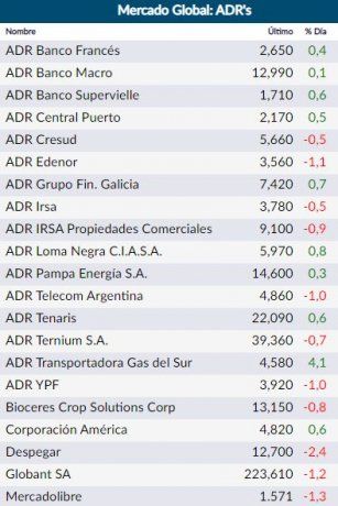 En Wall Street, por su parte, las acciones argentinas cerraron con subas y bajas. Al igual que en la bolsa local, Transportadora Gas del Sur lideró los ascensos con un alza del 4,1%; mientras que, por el contrario, las caídas fueron encabezadas por Despegar (-2,4%).