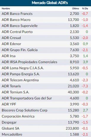 Medido en dólares, el S&P Merval cayó un 0,6% en un día en el que los ADRs de empresas argentinas cerraron con mayoría de bajas. Se destacó la suba de IRSA Propiedades Comerciales (+3,7%) y la caída de Tenaris (-7,3%).