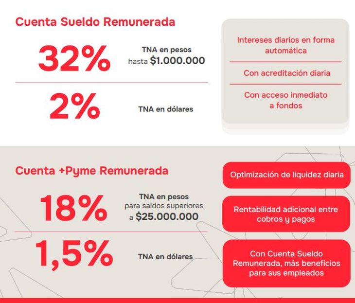 Para Cuenta +Pyme Remunerada, pensada especialmente para pequeñas y medianas empresas, ofrece una tasa de interés del 18% TNA en pesos para saldos superiores a $25.000.000 y del 1,5% TNA en dólares.