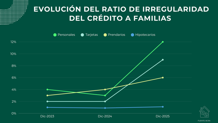 El deterioro no fue homogéneo. En el segmento corporativo, la irregularidad alcanzó el 2,5% (desde 0,8% un año antes), mientras que en los hogares el salto fue considerablemente más pronunciado. Según el Banco Central, los préstamos personales y las líneas con garantía prendaria explican buena parte de la tensión, lo que evidencia que el crédito destinado al consumo y a bienes durables es el más afectado.