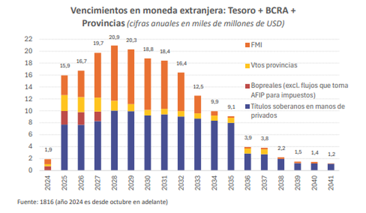 Sin embargo, la gran pregunta que se hacen todos los agentes económicos es cuánto margen tiene el Gobierno para estirar durante el próximo año el statu quo cambiario, que hasta acá incluye la vigencia del cepo, la tablita devaluatoria de 2% mensual y el dólar blend, que implica derivar el 20% de las exportaciones al CCL en lugar de ingresar a las reservas. CP considera que es “improbable” que pueda sostenerse ese esquema debido al gran agujero de divisas que el equipo económico necesitaría financiar. ¿Un agujero de qué magnitud? Según la consultora que dirigen Federico Pastrana y Pablo Moldovan, asciende a u$s19.700 millones para todo 2025.