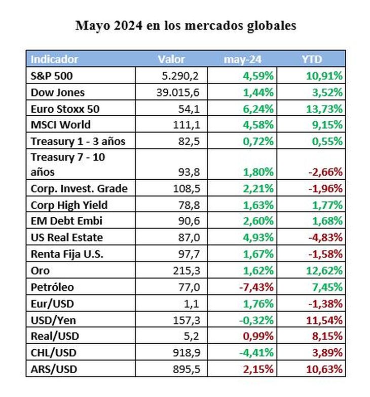 El mes de mayo demostró ser muy positivo para los mercados de riesgo, a pesar de las señales mixtas provenientes de la economía norteamericana. La volatilidad en la tasa a 10 años reflejó la incertidumbre del mercado respecto a futuras decisiones de la Reserva Federal sobre las tasas de interés. A pesar de esto, la tasa cerró el mes en torno al 4,4%, unos 20 puntos básicos por debajo de su punto inicial, proporcionando un gran respiro para los inversores en renta fija, destacó un informe de CRITERIA.
