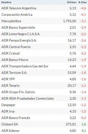 Entre las principales caídas de los ADRs de empresas argentinas aparecieron Telecom (-4,6%); Corporación América (-4,1%); Mercado Libre (-3,1%); Grupo Supervielle (-2,9%); Loma Negra (-2,6%); y Pampa Energía (-2,6%). Las únicas excepciones del día fueron Edenor (+4,1%); Globant (+1,6%); y Bioceres (+1,2%).