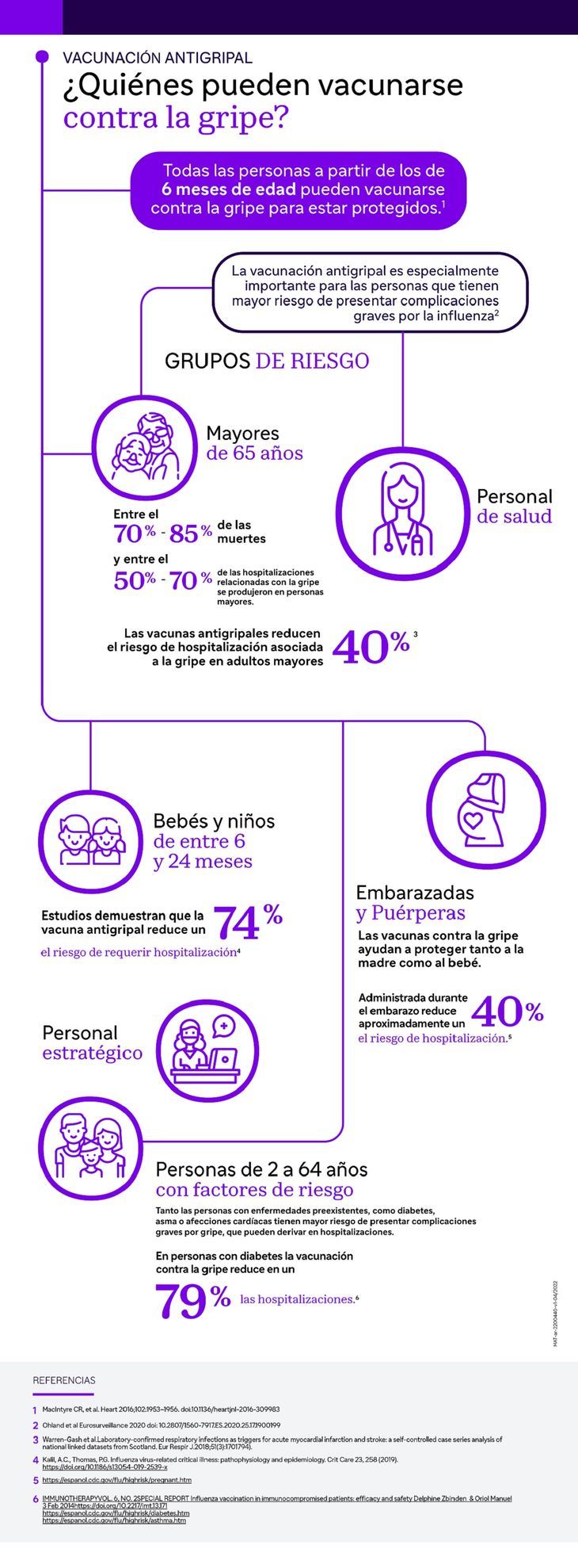 Todas las personas a partir de los 6 meses de edad pueden vacunarse contra la gripe todos los años para estar protegidos. La vacunación antigripal es particularmente importante en aquellas personas que tienen un mayor riesgo de presentar complicaciones graves como consecuencia de la gripe: personal de salud, mayores de 65 años, bebés y niños de entre 6 y 24 meses, embarazadas y puérperas, personas de 2 a 64 años con factores de riesgo tales como obesidad, diabetes, enfermedades respiratorias, enfermedades cardíacas, inmunodeficiencias congénitas o adquiridas, pacientes oncohematológicos, trasplantados y/o personas con insuficiencia renal crónica en diálisis, infección por VIH, entre otros, y personal estratégico. También cabe destacar la importancia de la vacunación antigripal en las personas del entorno de los pacientes de riesgo para evitar el contagio, tales como convivientes, familiares, acompañantes, entre otros.