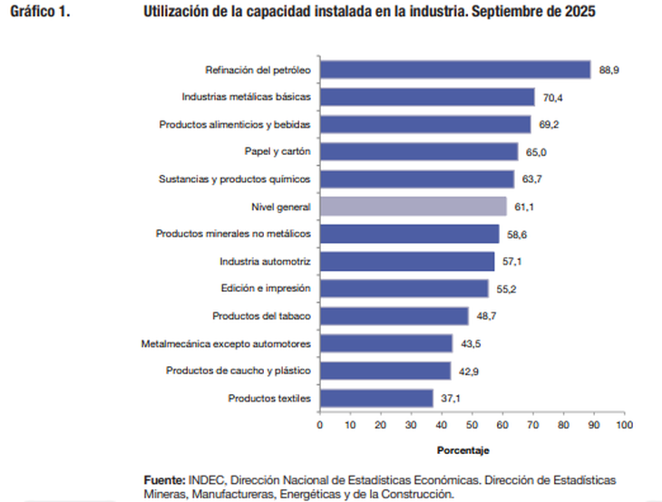 La industria utilizó el 61,1% de su capacidad instalada en septiembre, según informó el INDEC este jueves. De este modo, superó el 60% por primera vez en diez meses, aunque en términos anuales se observó la tercera caída consecutiva.