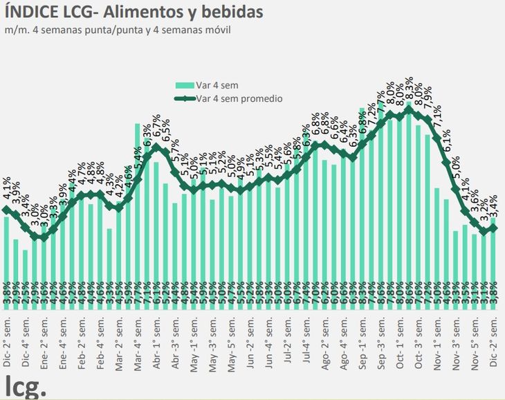 Así, el índice de alimentos y bebidas que lleva LCG presentó una inflación mensual de 3,4% promedio en las últimas 4 semanas y de 3,8% punta a punta en el mismo periodo. Los datos de la consultora revelan una tendencia a la baja que comenzó a verse en octubre y es más pronunciado en el rubro carnes que en los otros tipos de alimentos. Sin embargo, en la segunda semana del mes se vió un índice algo superior del de la previa, que tuvo el nivel más bajo mensual (3,2%) desde la segunda semana de enero, cuando había sido del 3% la inflación de alimentos de las últimas cuatro semanas previas.