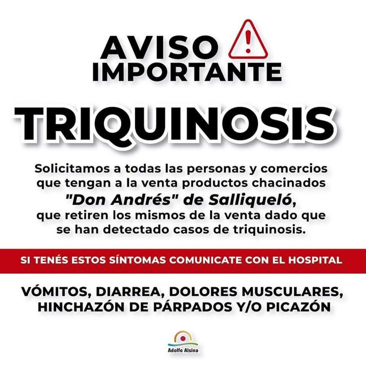 Las muestras de ambos comestibles fueron analizadas por un laboratorio y resultaron positivas a Trichinella spiralis. Según informaron desde la cartera sanitaria, estos se distribuyeron en los municipios de Daireaux, Hipólito Yrigoyen, Coronel Suárez, Saavedra, Tres Lomas, Trenque Lauquen, Púan, Rivadavia y Adolfo Alsina. Frente a esta situación, los equipos de salud intensifican la vigilancia epidemiológica.