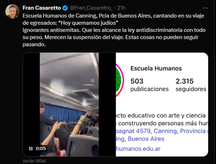 La viralización de un video con cánticos antisemitas de un grupo de estudiantes de la Escuela Humanos de Canning y el coordinador de la empresa Baxtter, durante su viaje de egresados en Bariloche, generó un repudio inmediato en las redes y en el ámbito político. Tras un reposteo con un mensaje de rechazo en X por parte del presidente, Javier Milei, el ministro de Justicia, Mariano Cúneo Libarona, presentó una denuncia penal en Comodoro Py . La misma quedó a cargo del juez Sebastián Ramos, bajo la figura de “instigación a cometer delito” según la Ley 23.592.