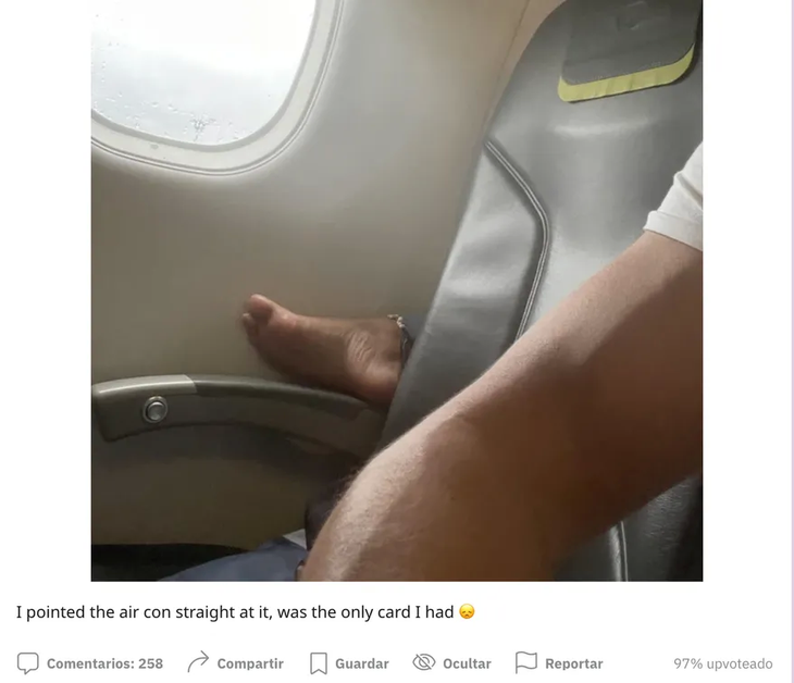 Al ver que tenía un pie descalzo a su costado, no tuvo otra mejor idea que la de encender el aire acondicionado y dirigirlo hacia la extremidad de su compañero de asiento. “Era la única tarjeta que tenía”, dijo el usuario para enfatizar en que no le quedó otra solución y que fue lo único que le llegó a la mente para poder darle un fin a su incomodidad.