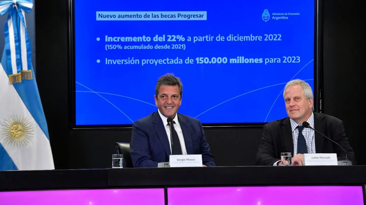 El ministro de Educación de la Nación, Jaime Perczyk, junto con el ministro de Economía, Sergio Massa, anunció un aumento en el monto del programa de Becas Progresar. El programa que beneficia a casi 1,7 millones de alumnos secundarios y universitarios.