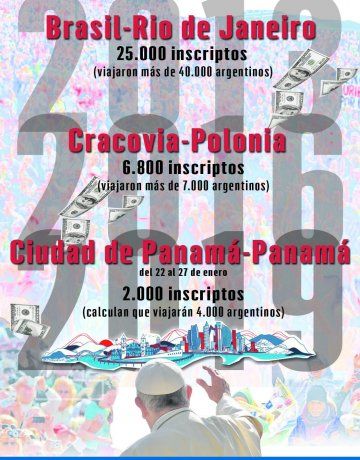En 2013, recién electo y con el furor a flor de piel, Francisco convocó a más de 40.000 argentinos para el mismo evento que se realizó en Río de Janeiro. En ese momento, el dólar apenas llegaba a los $10, a la vez que la distancia que separa al país de Brasil favoreció el traslado de fieles. Tres años después fueron alrededor de 7.000 los que viajaron a Cracovia, Polonia. En tanto, para el viaje a Panamá, que se realizará entre el 22 y 27 de este mes, hay sólo unos 2.000 inscriptos, según datos aportados por la Pastoral de Juventud nacional. “En marzo del año pasado había alrededor de 8.000 argentinos anotados para viajar. Pero la situación económica y la fuerte suba del dólar hicieron que muchos tuvieran que bajarse del viaje”, aseguró una fuente de esa organización. En lineas generales, calculan que entre inscriptos (es decir, quienes viajan representados por las diferentes diócesis) y quienes lleguen hasta allí por su cuenta, serán al rededor de 4.000 argentinos.