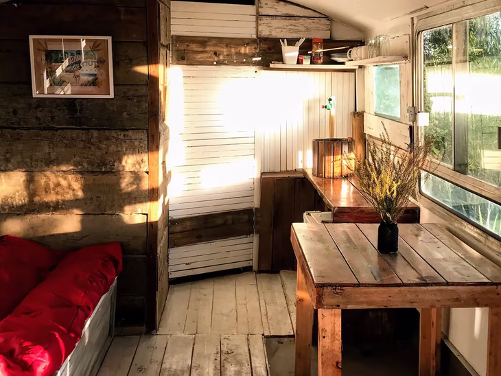A 90 km al norte de Buenos Aires, en la ciudad de Zárate a orillas del río Paraná, Glamping Bus está conformado por pequeñas cabañas que son antiguos buses en desuso, restaurados y acondicionados por sus propios dueños.