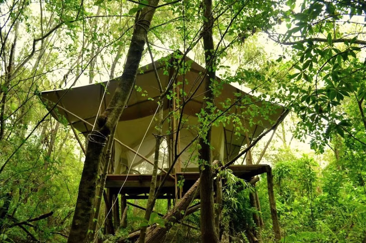 Las carpas están ubicadas entre los árboles del bosque y cuentan con muchas comodidades como sommiers, amenities, baño privado, heladera y aire acondicionado.