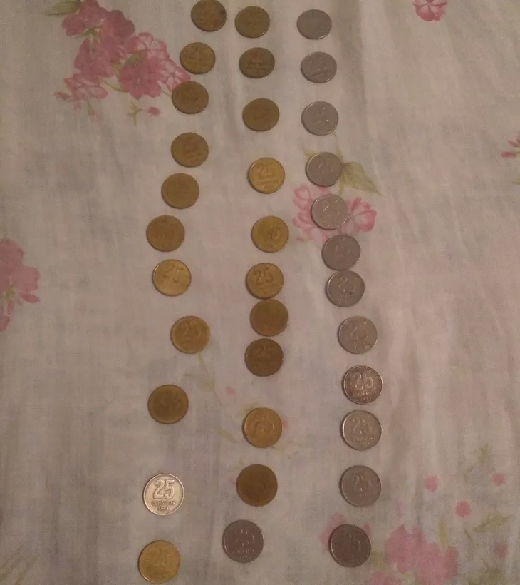 La tendencia a las monedas raras se enfoca en las monedas de 25 centavos, particularmente las que no están imantadas. Este lote que se vende por la plataforma Mercado Libre tiene 34 monedas de 25 centavos argentinos doradas y plateadas, y los años varían entre 1992, 1993, 1994, 1996, 2010 y 2019.